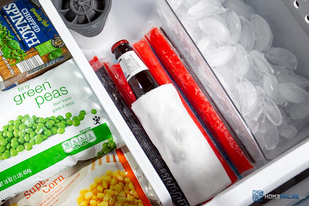 For a quick hack to chill your beverage bottles wrap a wet paper towel around a room temperature bottle. Place it in the freezer and 15 minutes later you will have a cold beverage. Just don’t forget it in the freezer!