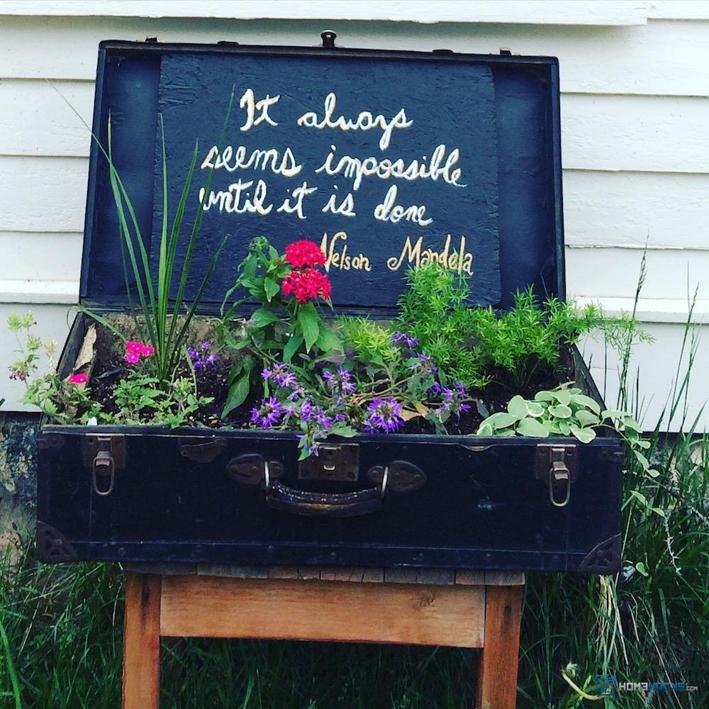 When my partner brought home two old rusted, smelly trunks and I refused to let him bring them in the house, he made lemons out of lemonade, and made me happy in the end. I would have never thought to transform an old trunk into an outdoor planter, but that is exactly what he did. In our case he mounted each chest to a wooden platform (which is optional). Otherwise, just fill the chest up with dirt and plant your favorite perennials, annuals or make a trunk herb garden, whatever you prefer.